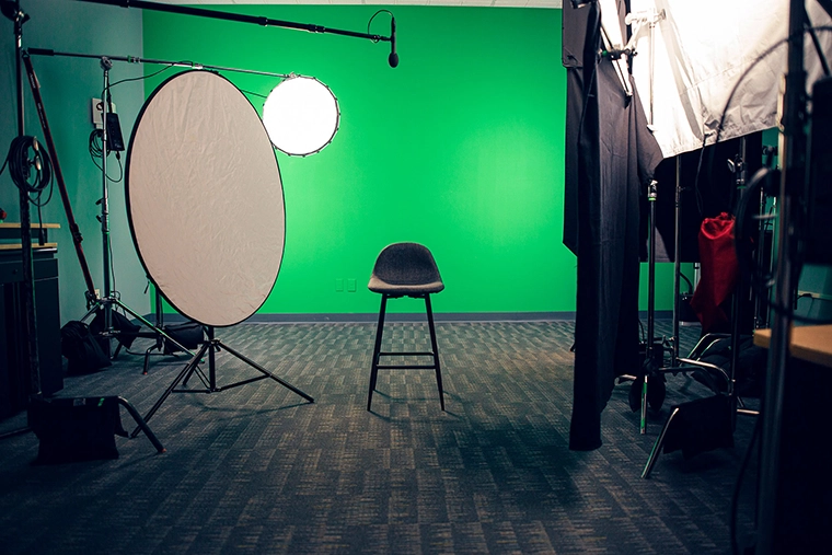 Studio B is ideal for projects requiring a more intimate, controlled environment. This cozy space provides versatility to create high-quality visuals, perfect for one or two-person shoots such as interviews, training videos, product photography, or talking head content. An 18-foot green screen wall is one of Studio B’s standout features, allowing you to create immersive backgrounds for any setting, from breathtaking landscapes to futuristic cityscapes. Additionally, Studio B boasts the Whisper Room, a meticulously designed sound-treated space ensuring pristine audio quality for voice-over services and narration.